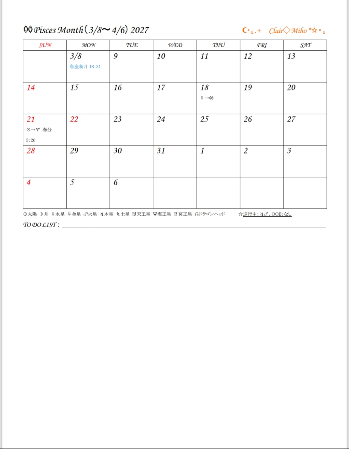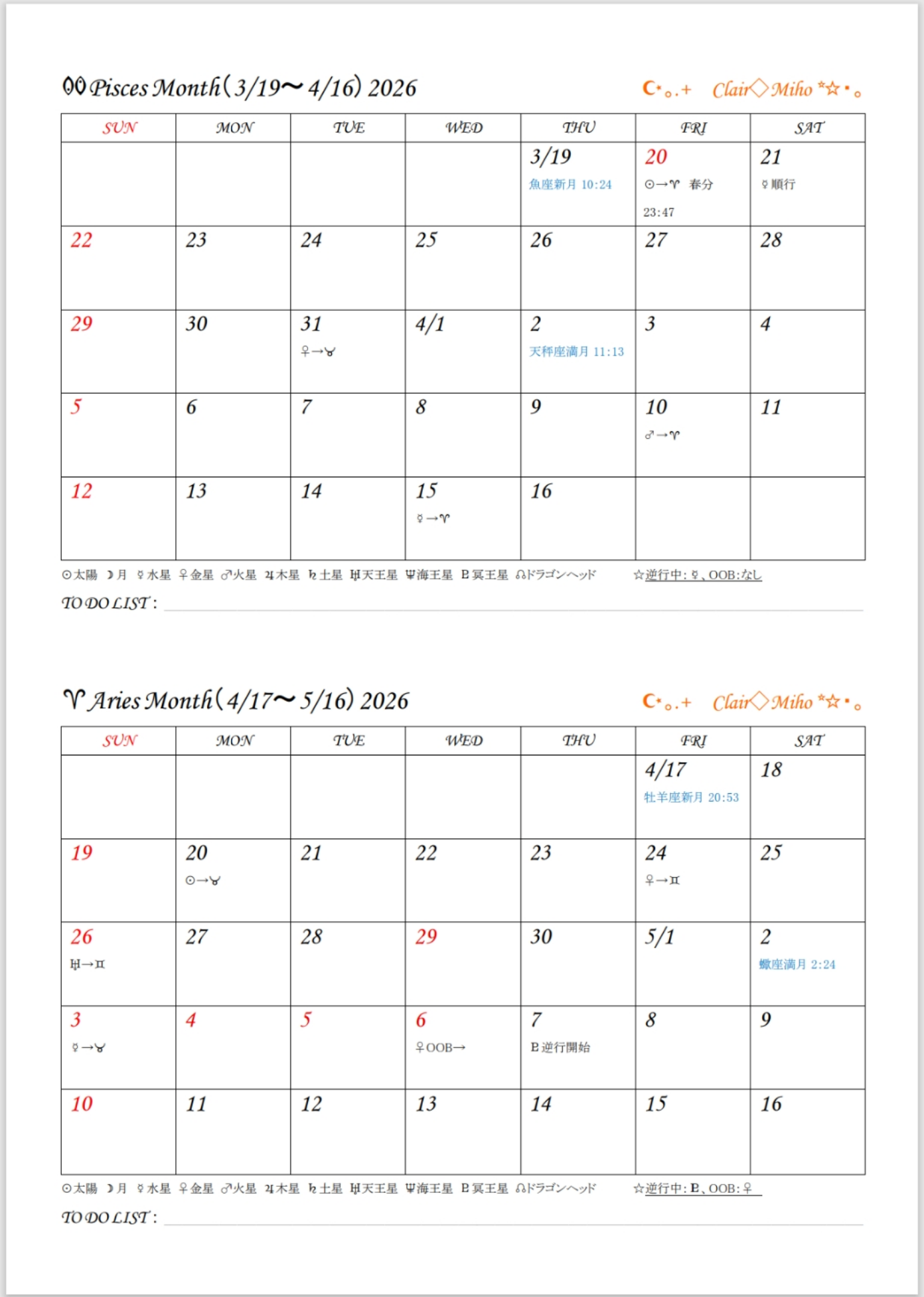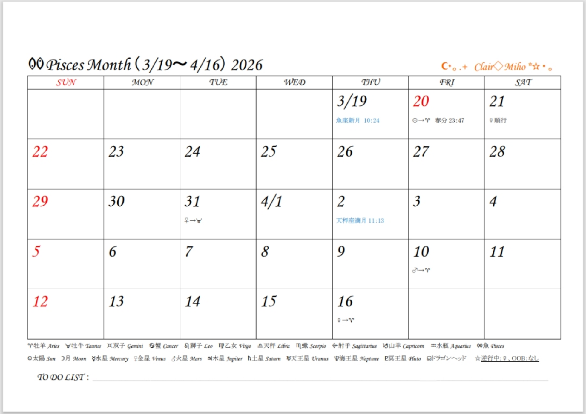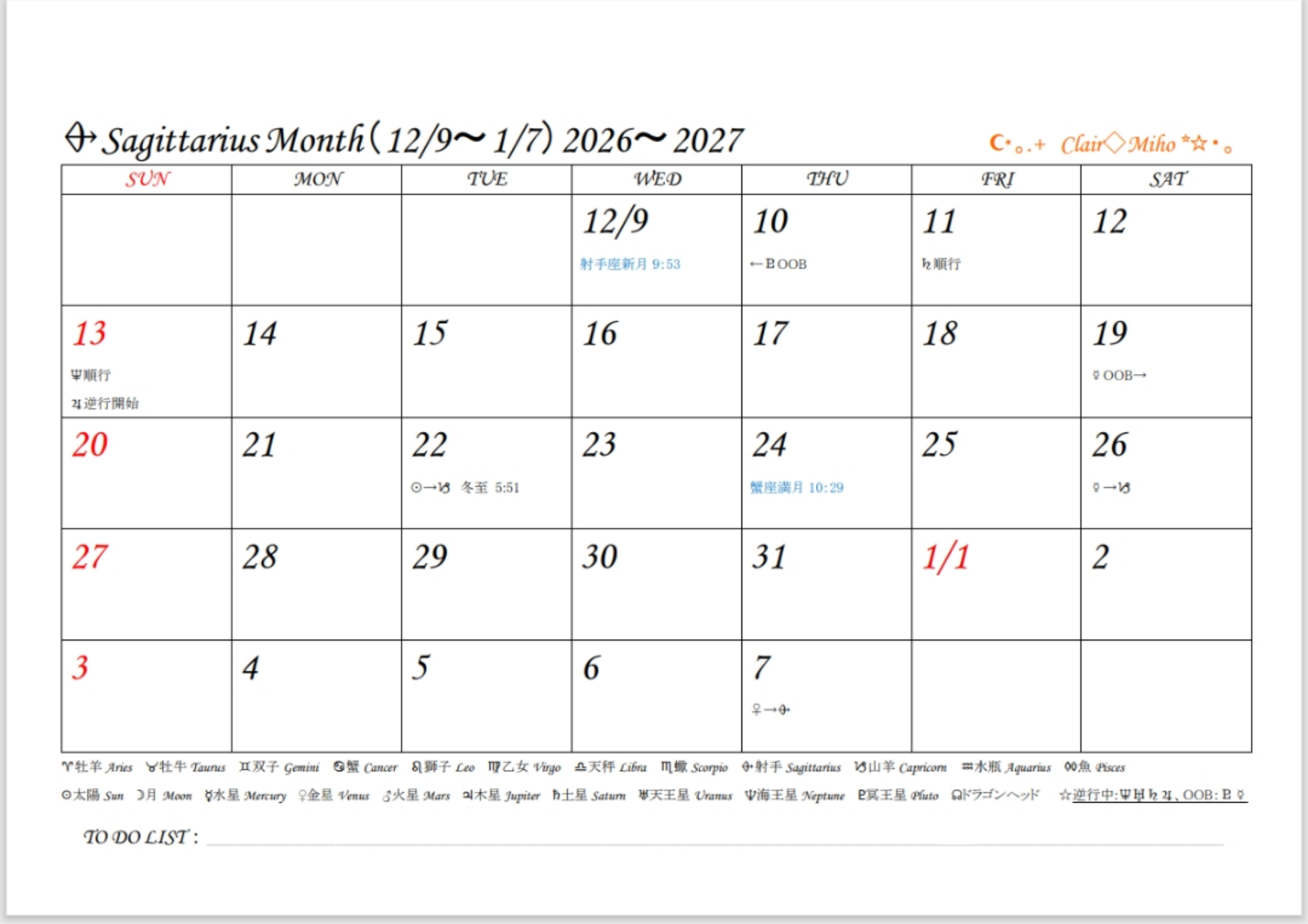 カレンダーには占星術記号がありますが、初心者の方にも分かるよう日本語も載せています。