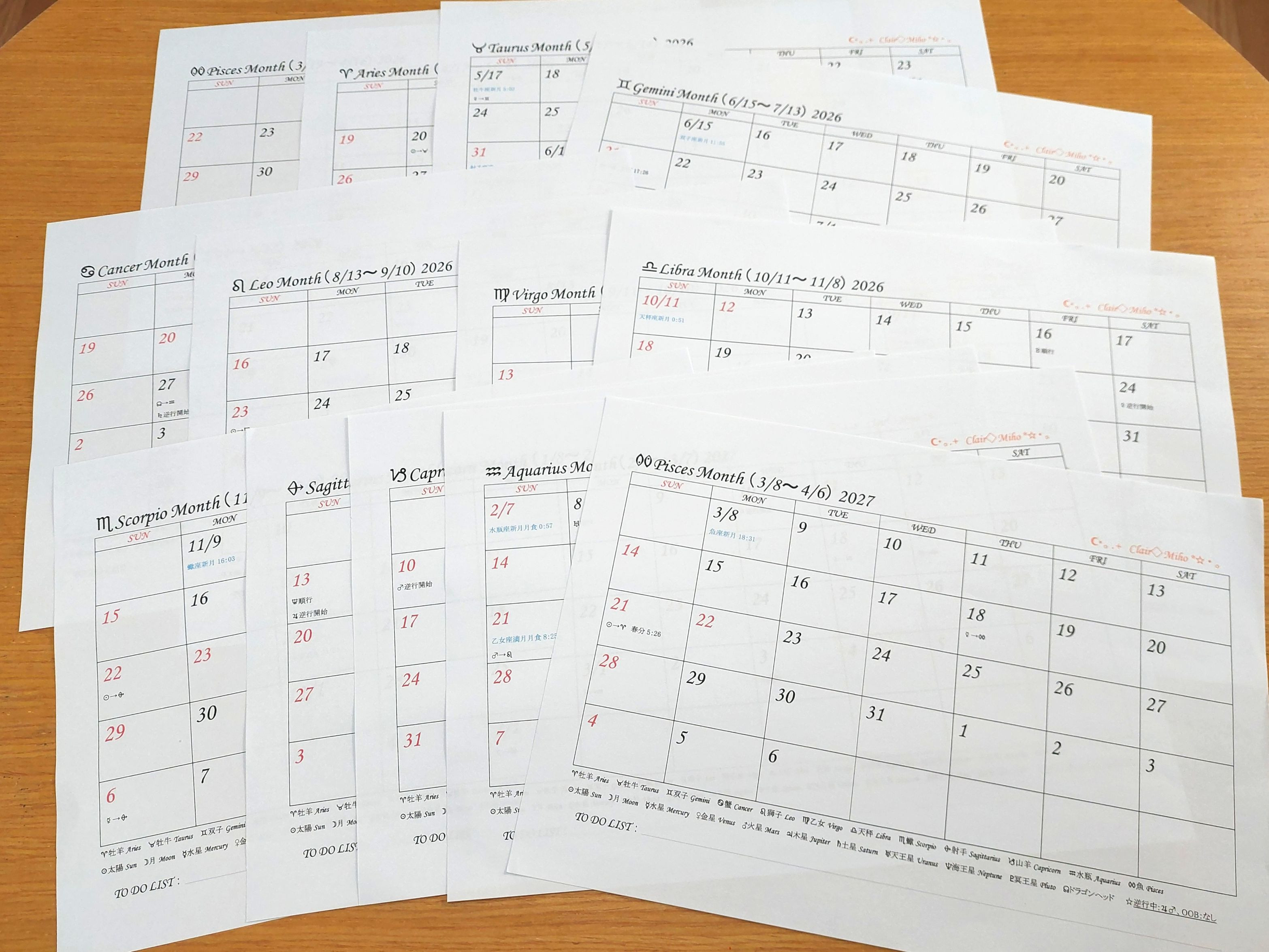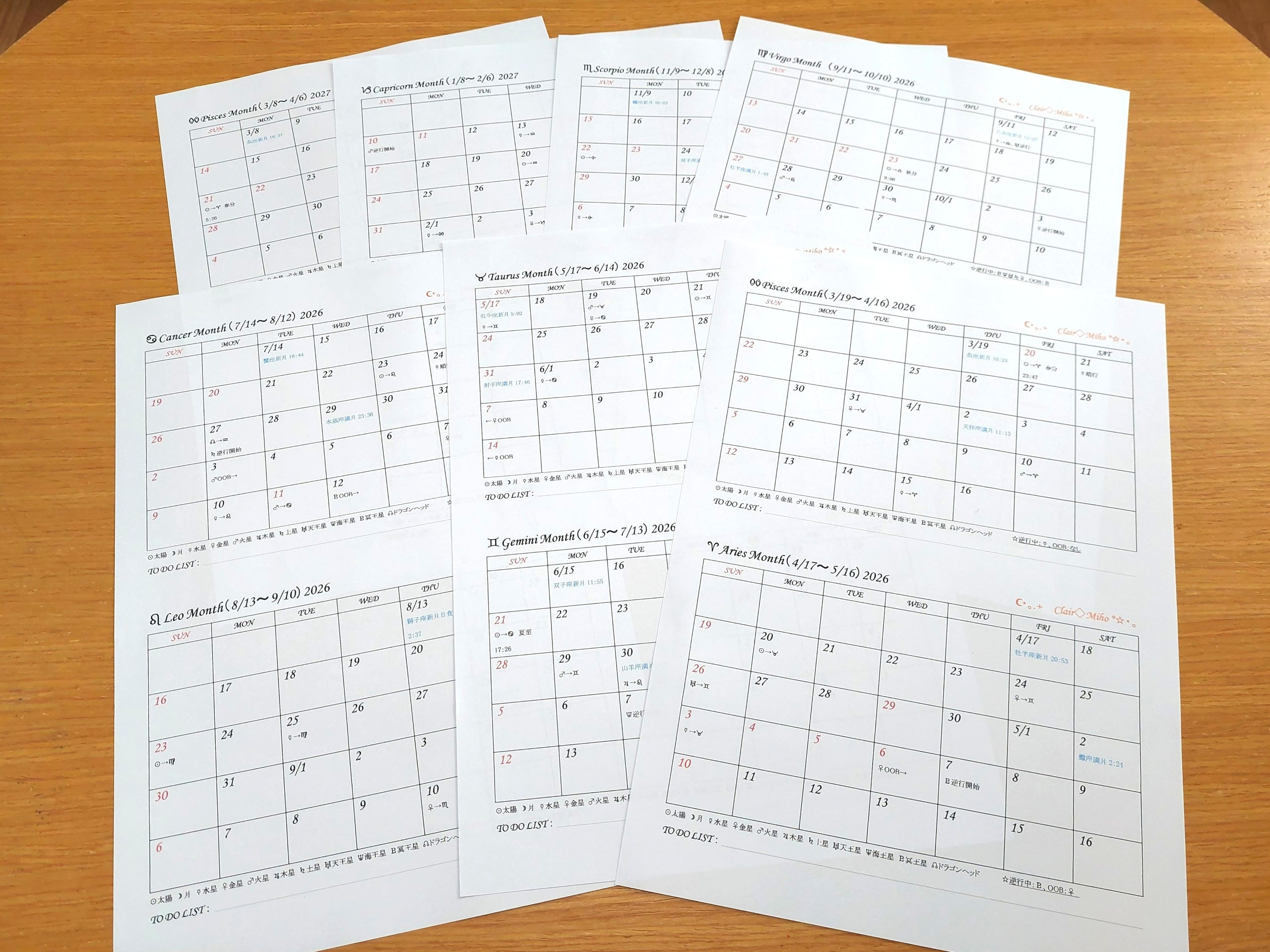 新月始まりカレンダーは、月のサイクルに合わせて暮らしたい方、月星座を意識したい方、占星術を勉強している方にお勧めです。
